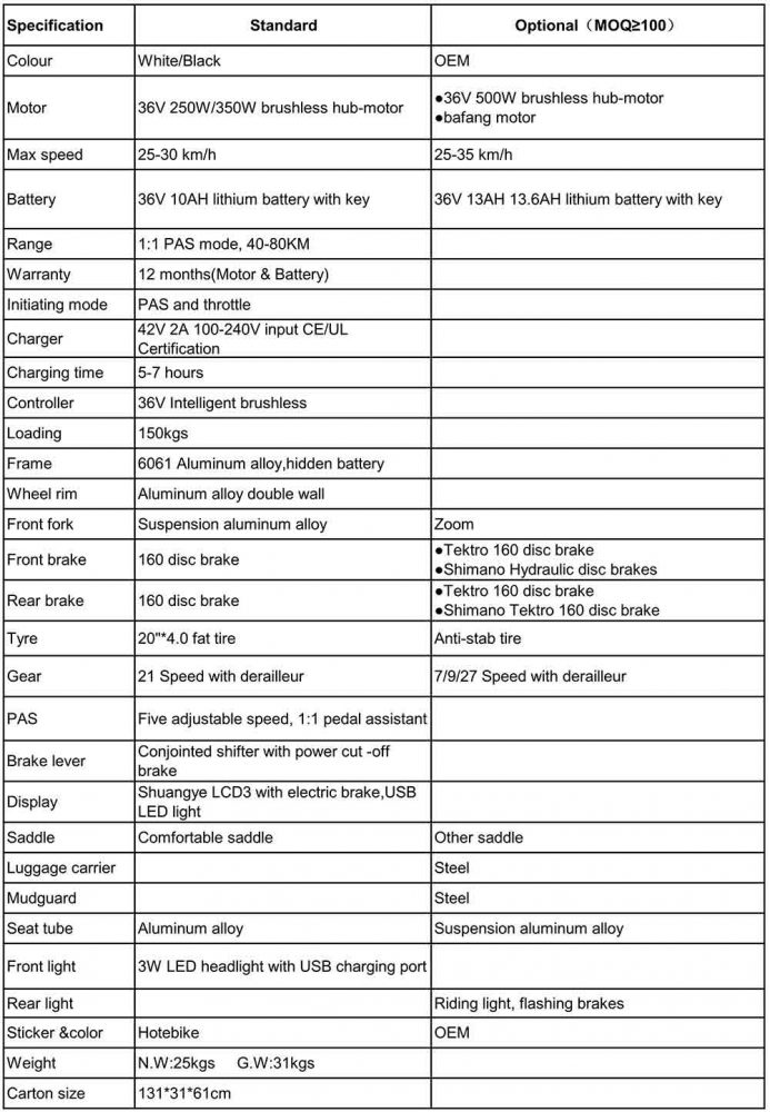 The 20 inch best fat tire electric bike is designed with fat tyres and fast 350W Power. Built with a 36V 10AH Lithium Battery built into the frame. Featuring a Top Speed of 30KM/h And Distance of 80km per charge. 21 speed, multifunction LCD display, front & rear disc brake, 3w LED front light.